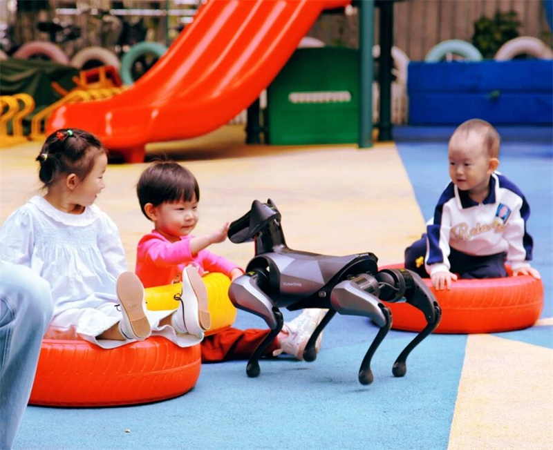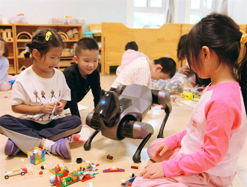 创意搭建区,孩子们专注拼乐高,机器狗灵活穿梭,精准递上一块块积木;默契配合间,操场上,机器狗又化身活力玩伴,与孩子们一同奔跑嬉戏。默契的配合、亲密的协作,孩子们不仅学会与智能科技和谐共处,更在快乐互动中培养了面向未来的创造力、协作力和探索欲。